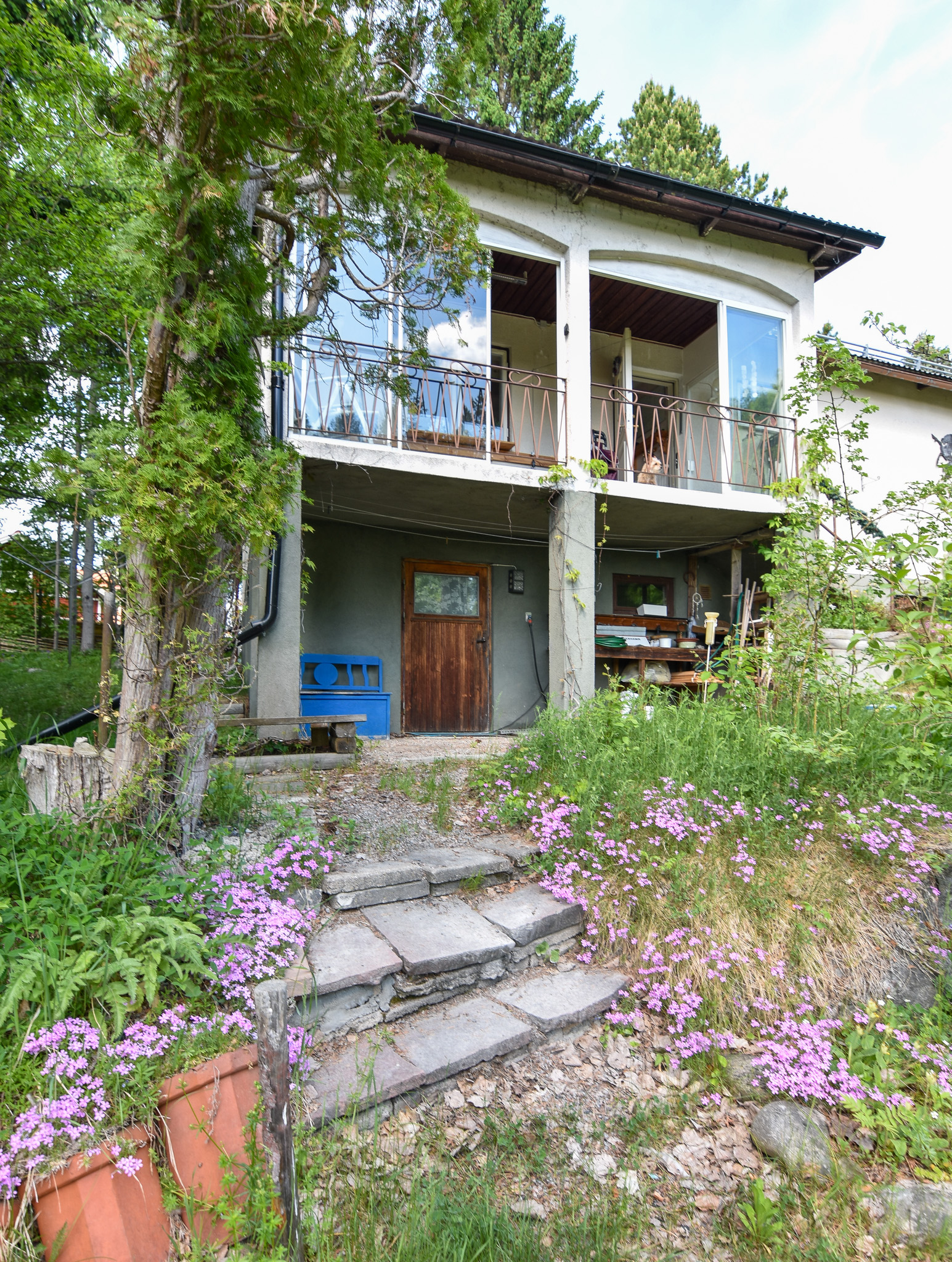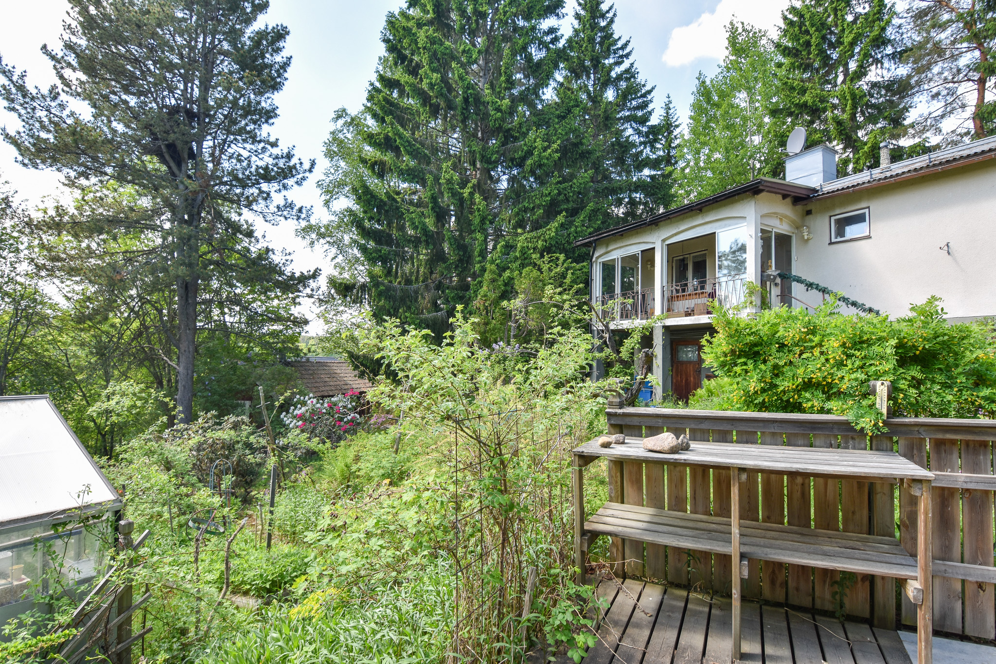 Inglasad terass/balkong vid husets entré i soligt söderläge. Fristående trädäck/altan invid växthuset i trädgården.