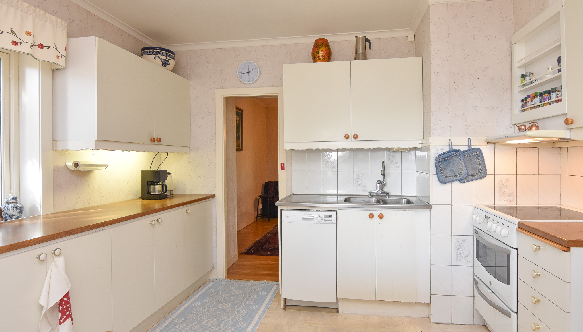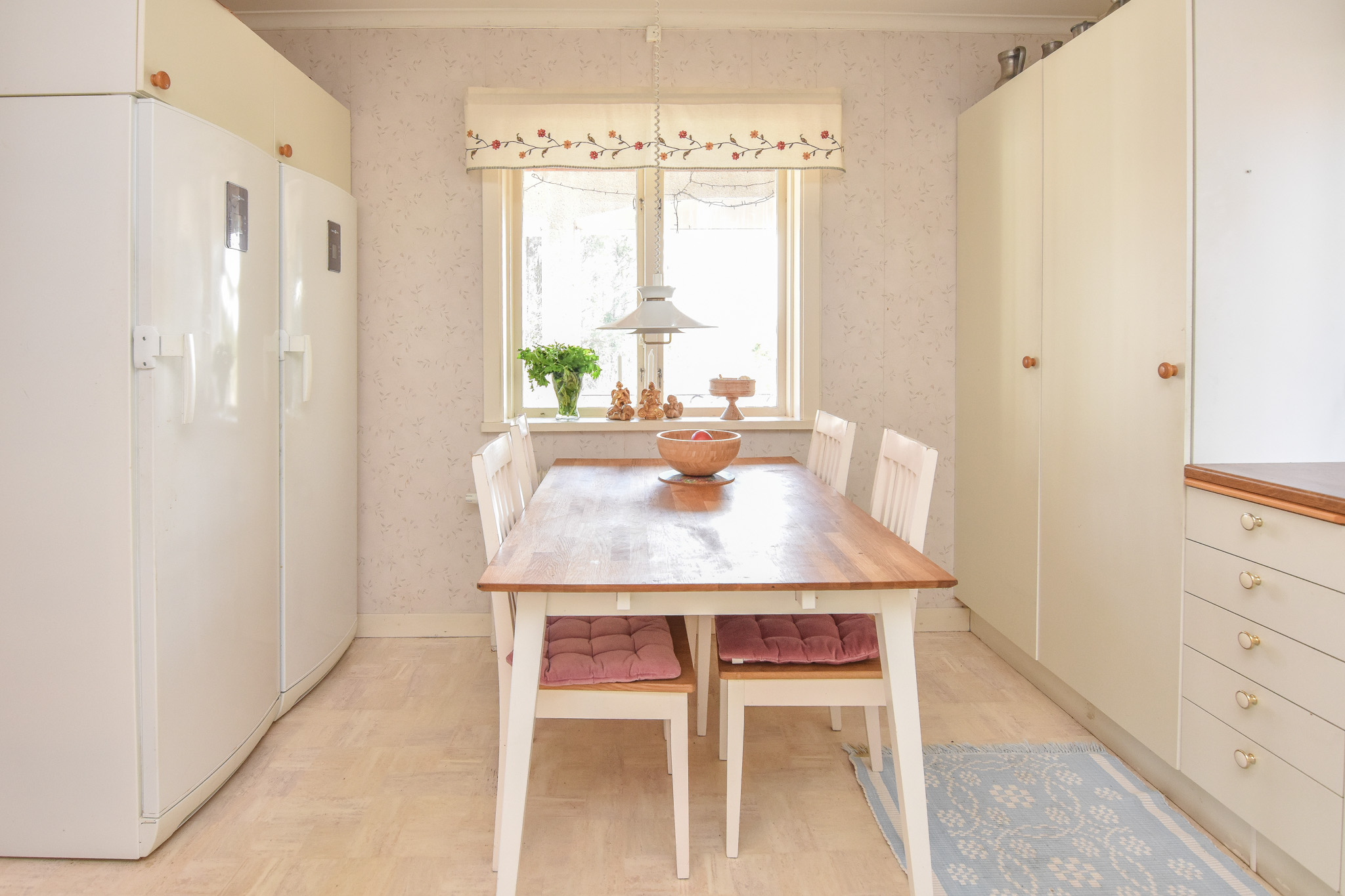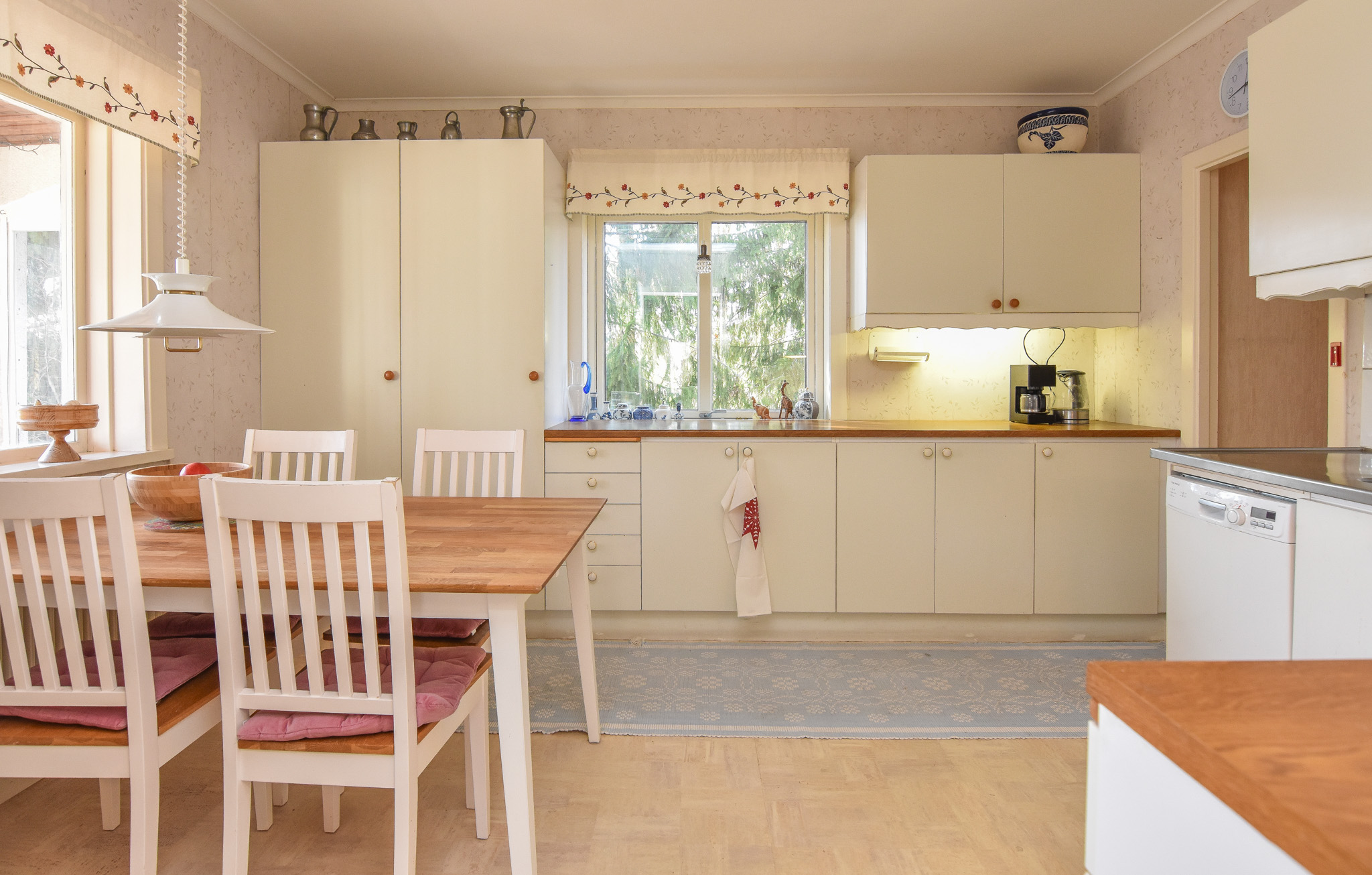 Ljust kök med plats för matgrupp