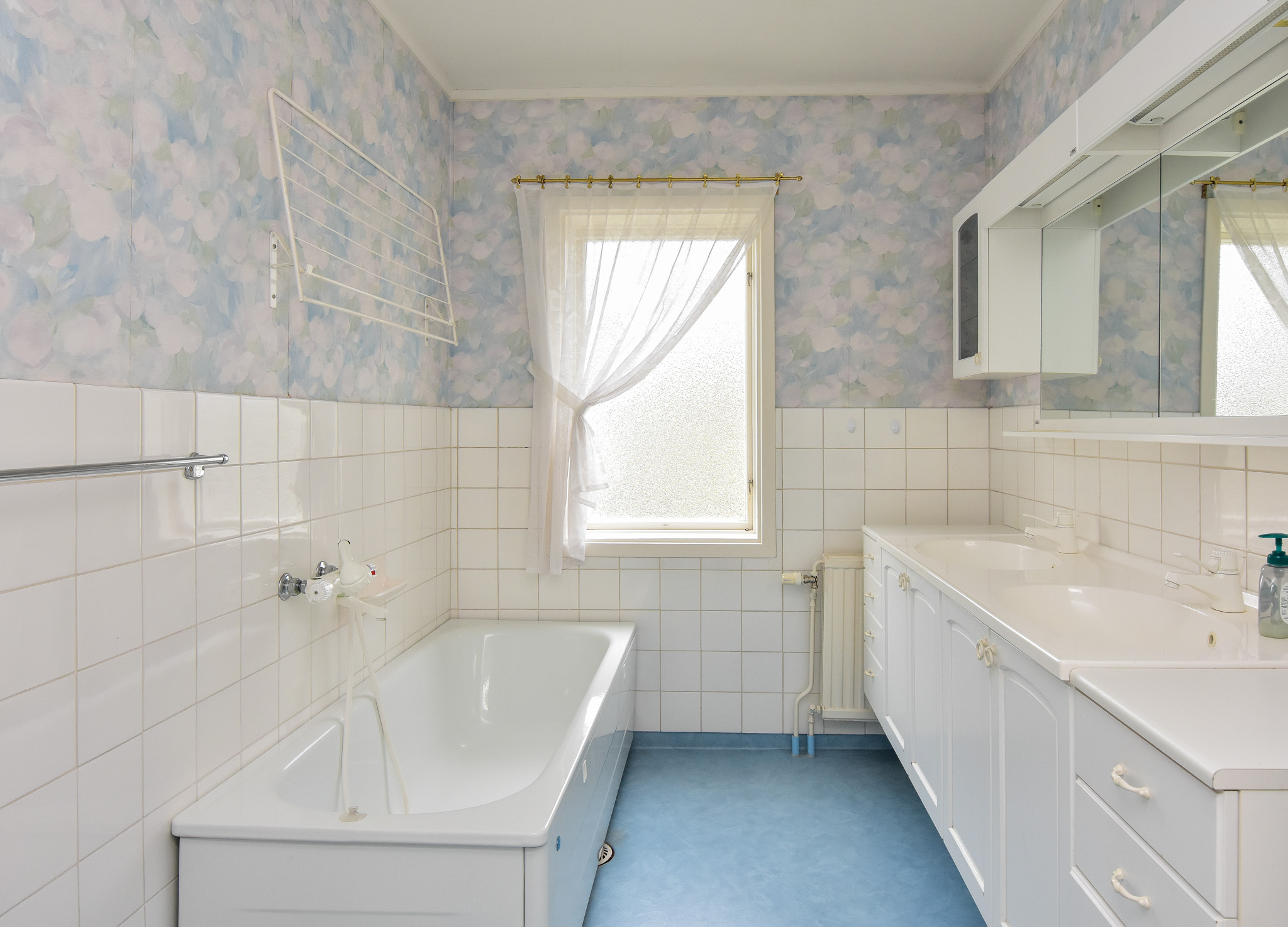 Ett fräscht badrum med våtrums-tapet/golv. Här finns badkar samt toalett och hadfat.
