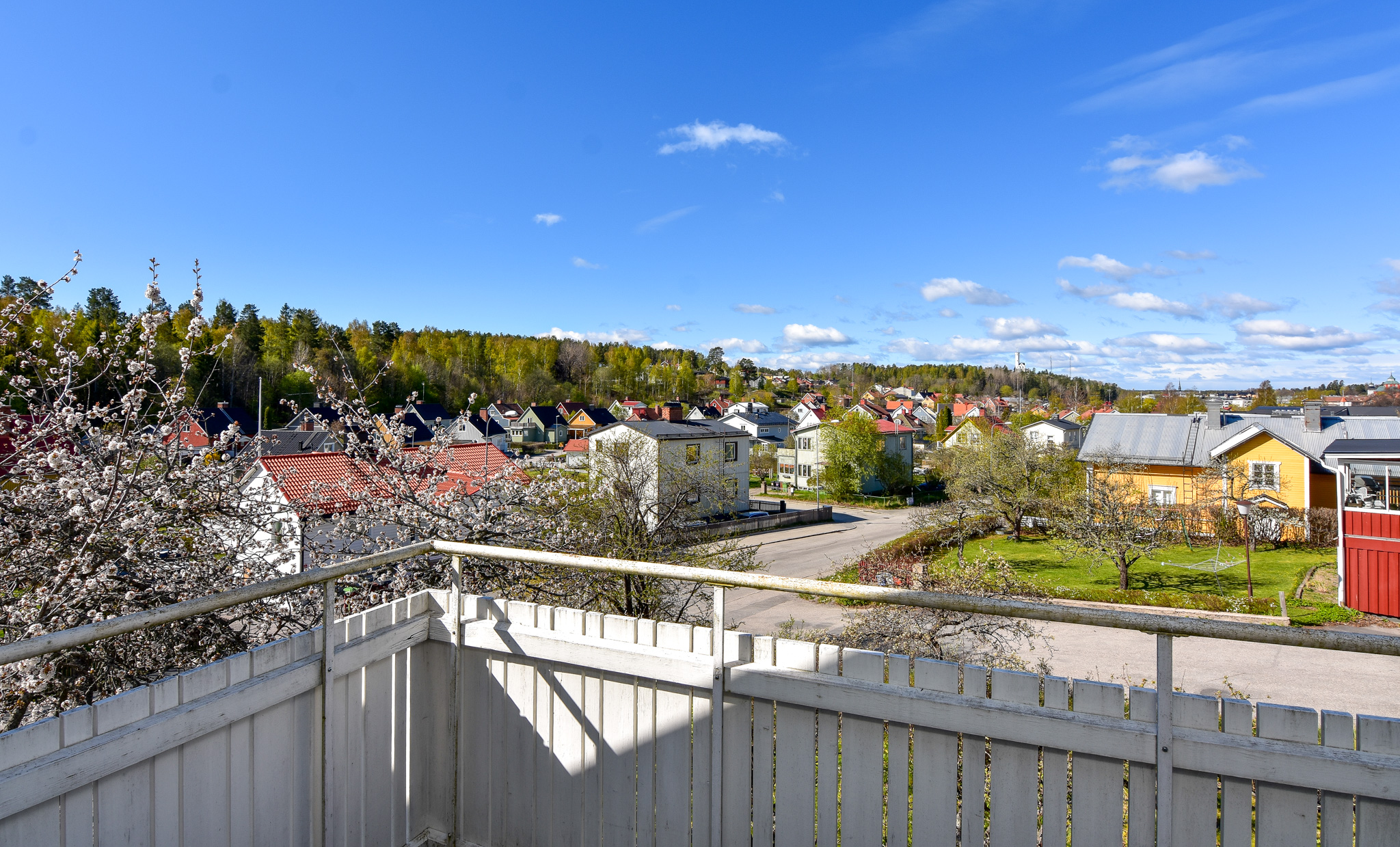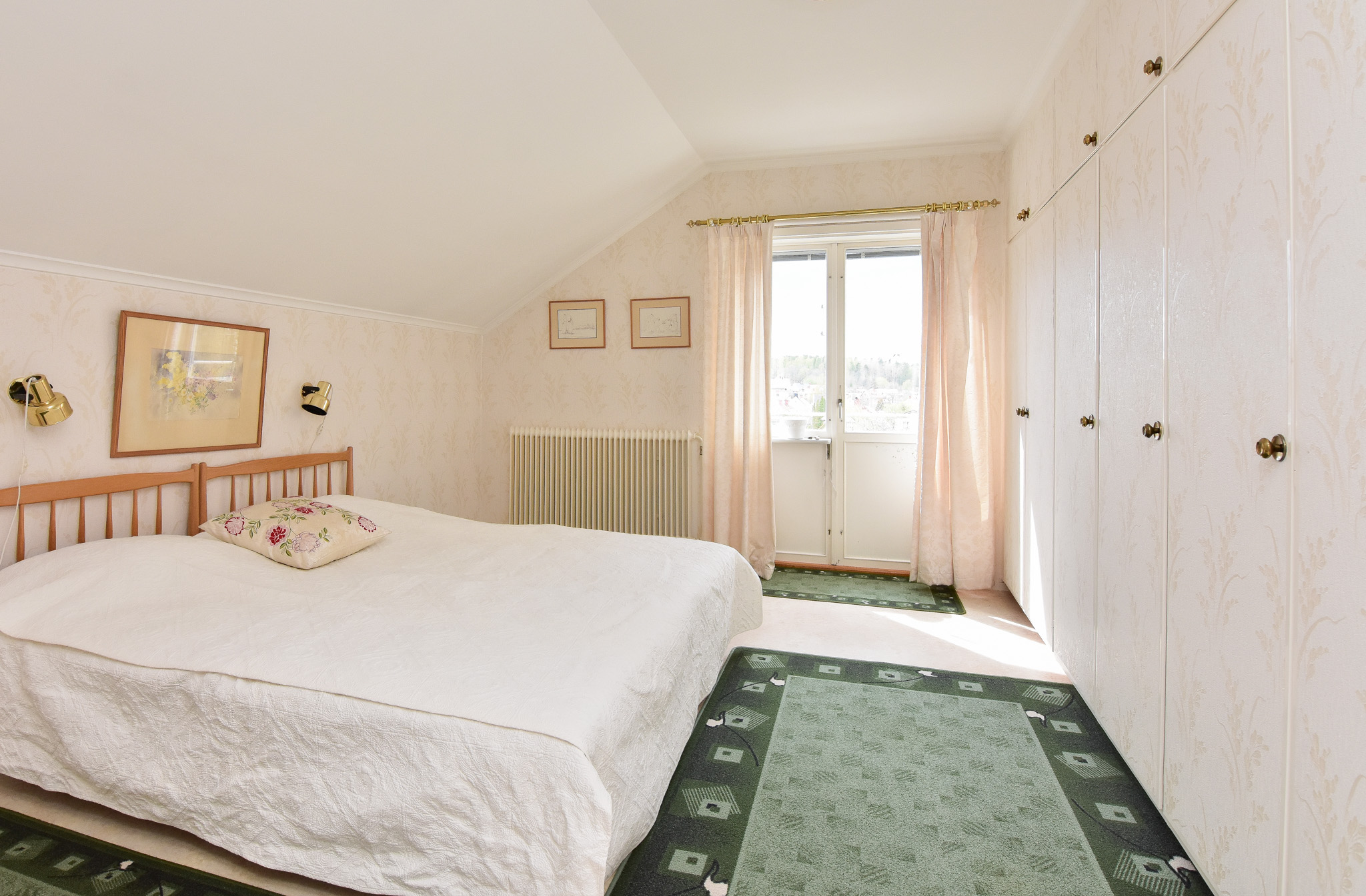 Sovrum med hel platsbyggd garderobsvägg och balkong med utsikt mot Östra berget.