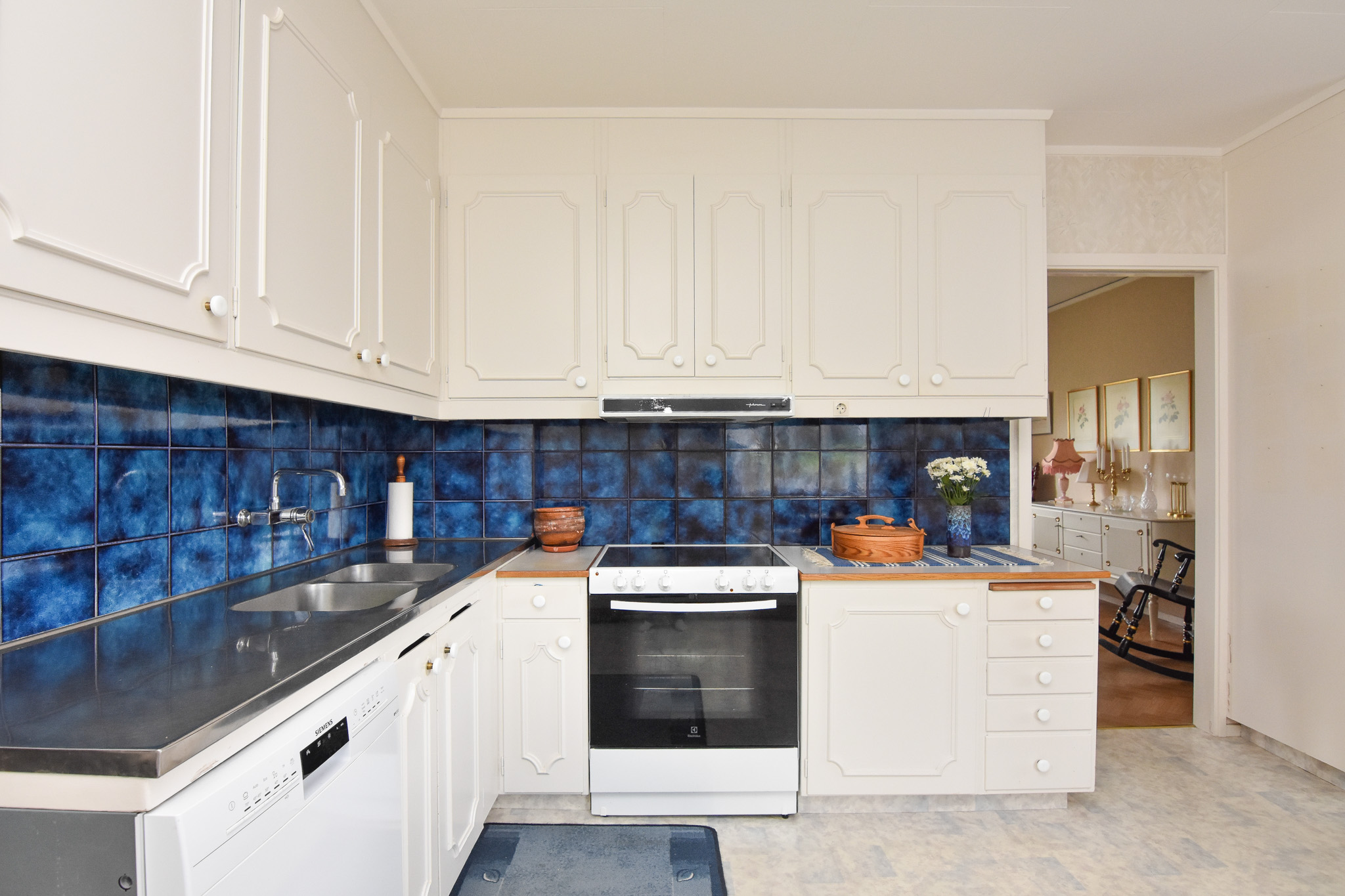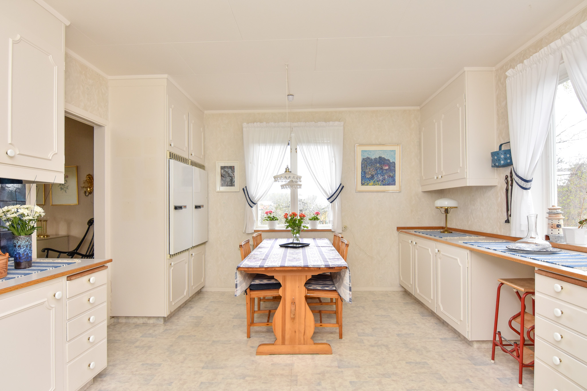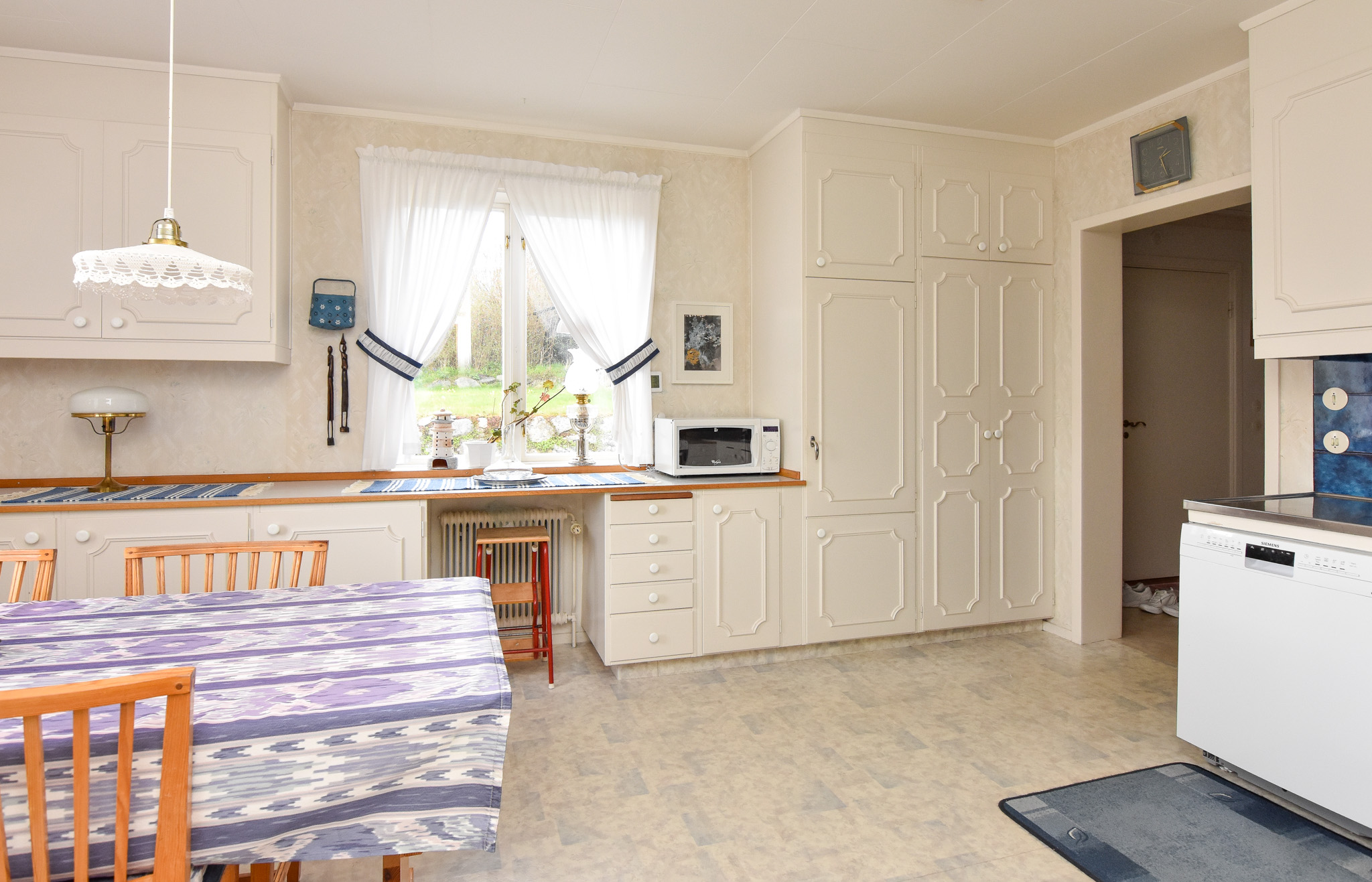 Ett hemtrevligt kök med plats för matgrupp. Här finns hällspis, fläkt, diskmaskin och plats för kyl/frys. Köket har gott om förvaring med städskåp och ett riktigt skafferi. Gedigna Perstorps bänkskivor från 60-tal.