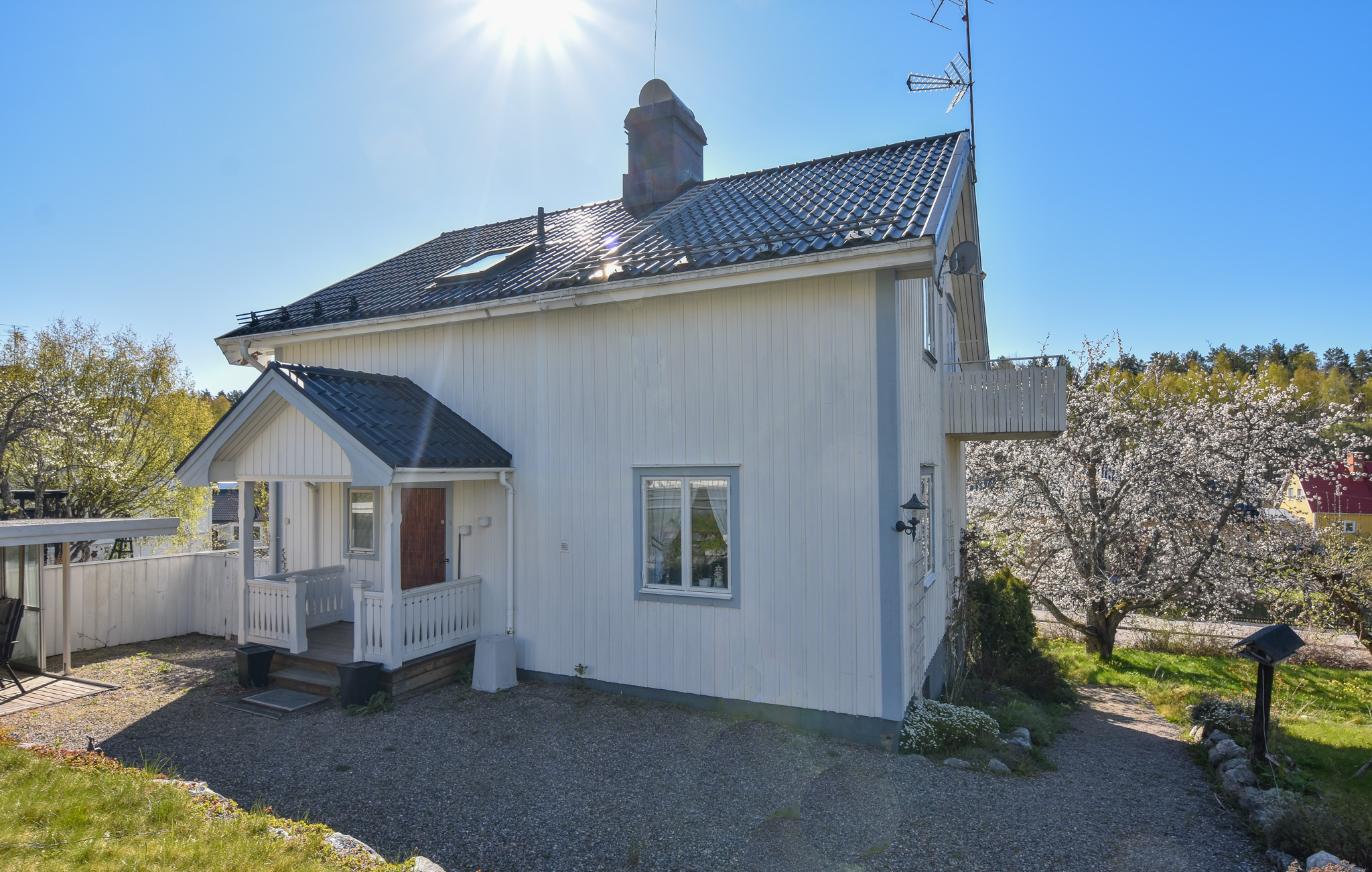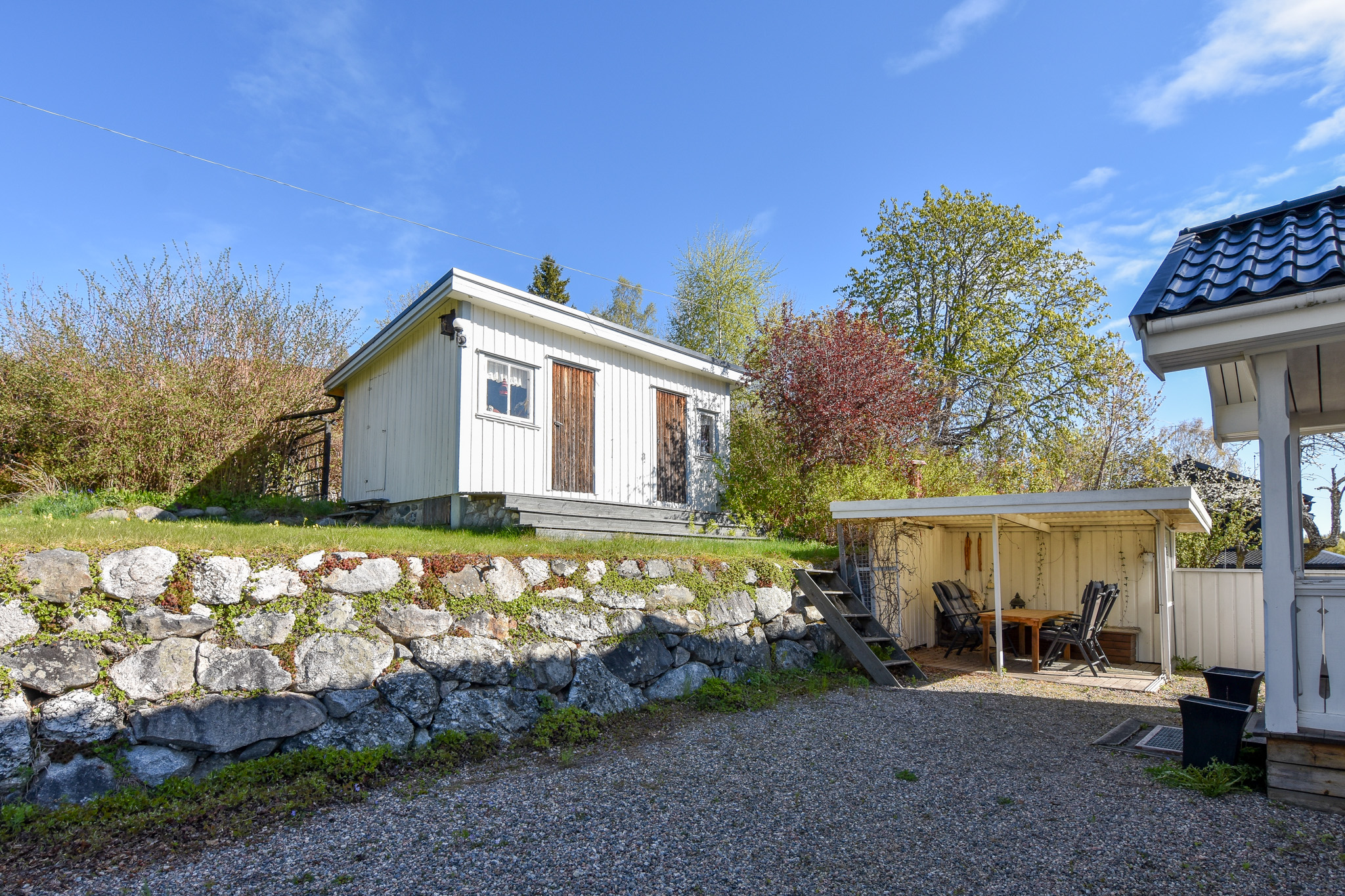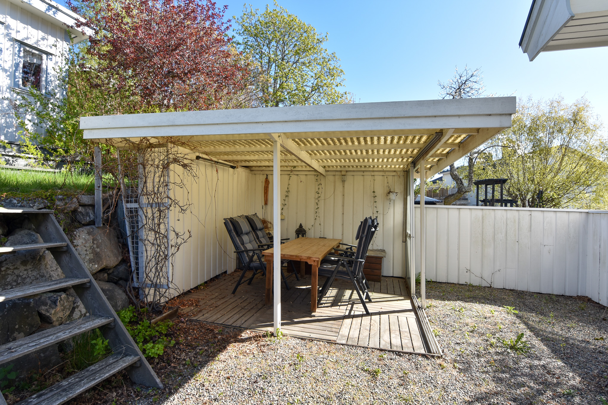 Utanför husets entré finns en pergola med glasade skjutdörrar. Här finns även en murad öppenspis.