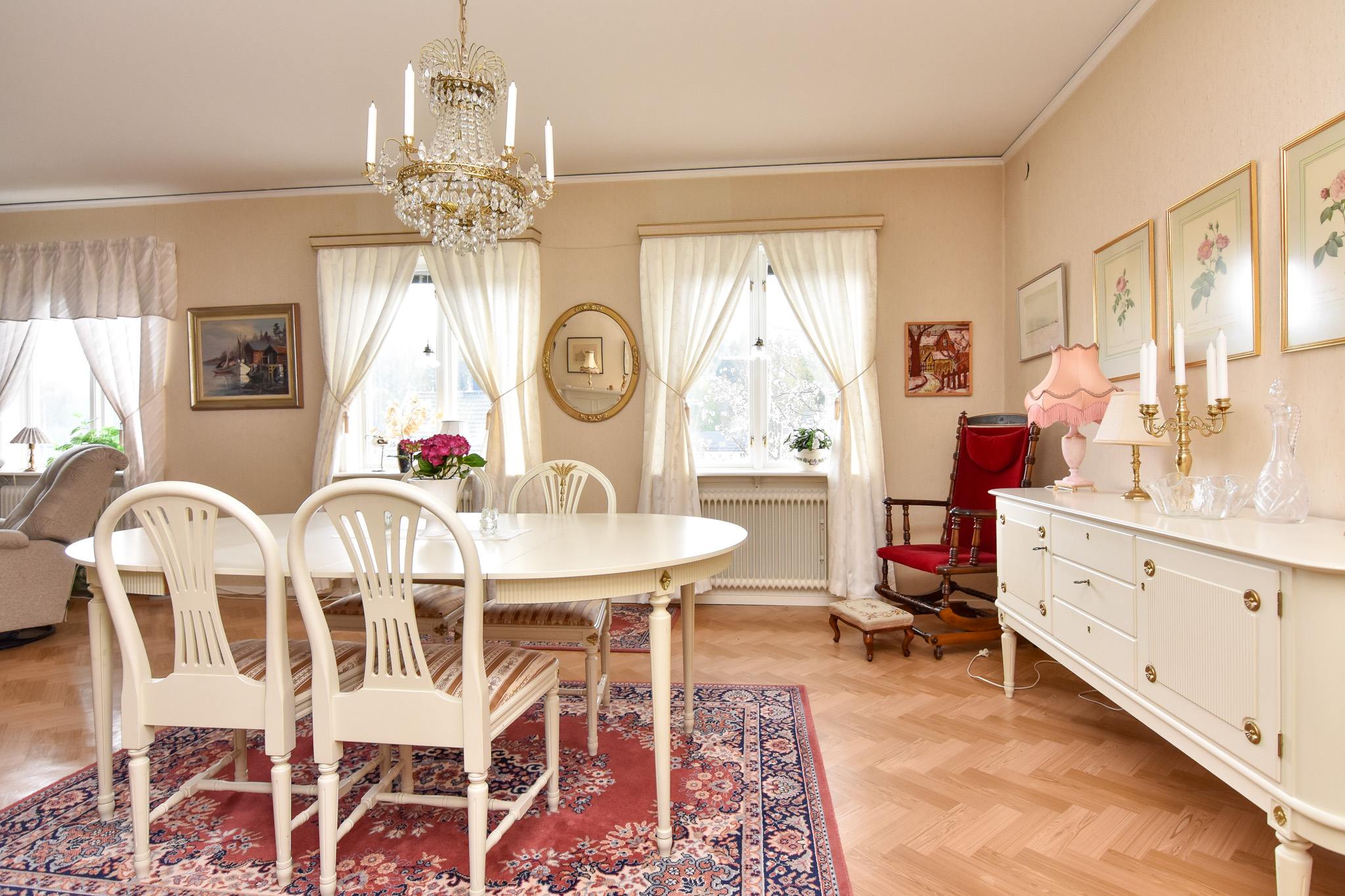 Ett trivsamt, rymligt mat-/vardagsrum. Här finns gott om plats för både matgrupp och soffgrupp. Rummet har flera fönsterpartier vilket ger en härlig atmosfär.