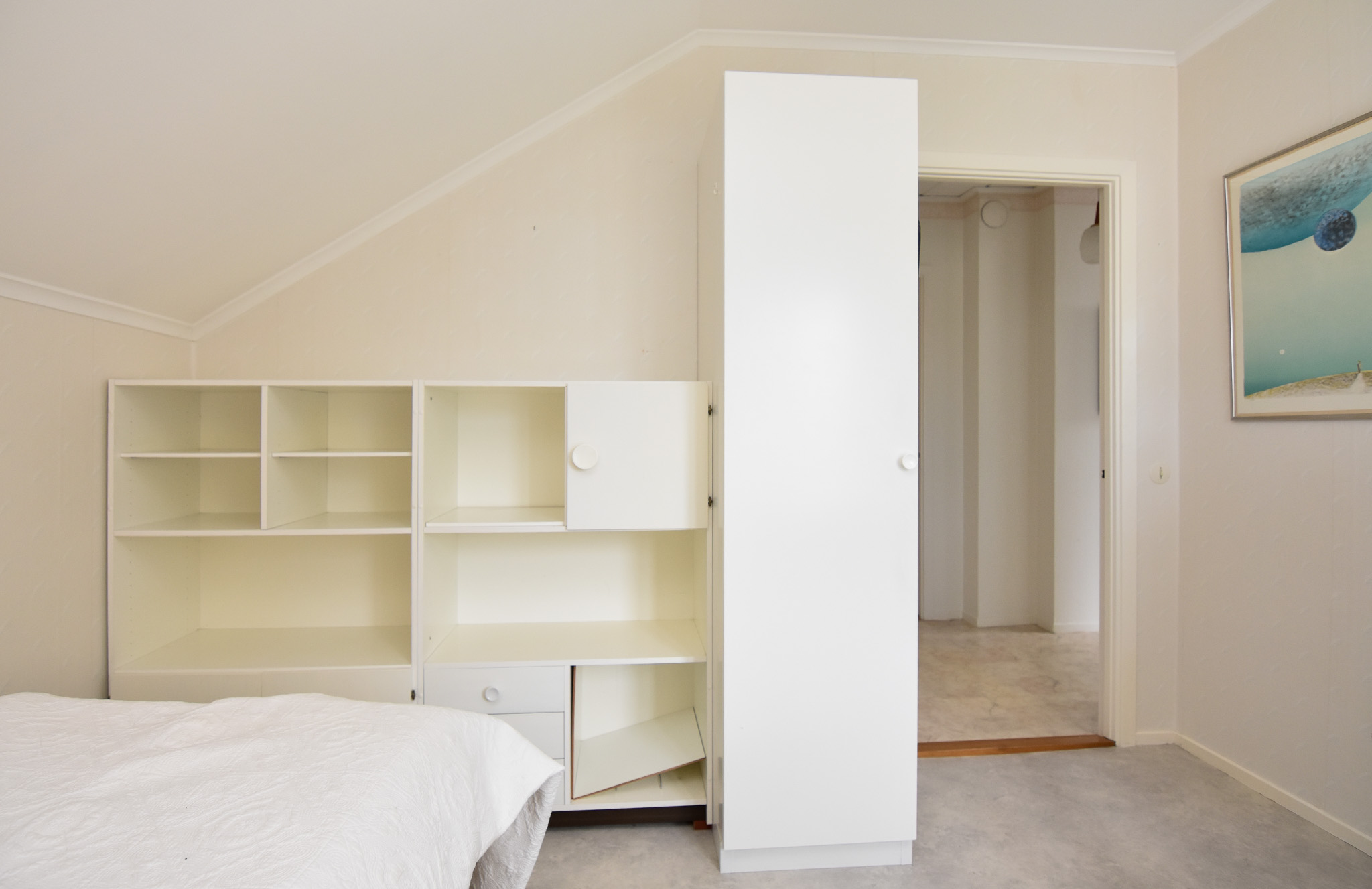 Sovrum med en platsbyggd garderob.