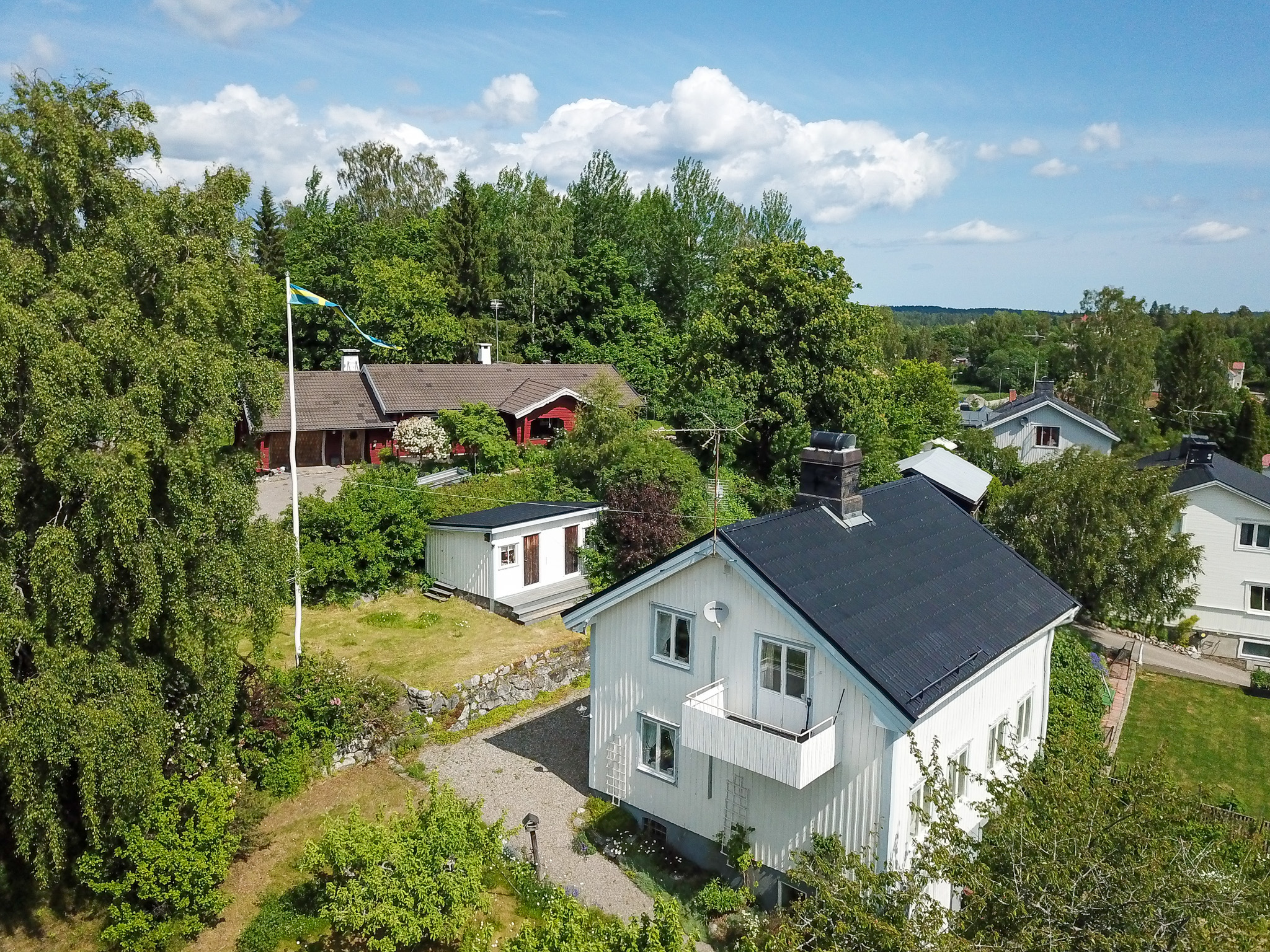 Garage i källaren med plats för en bil. Det finns även parkeringsmöjlighet på den asfalterade infartsvägen.Bredband