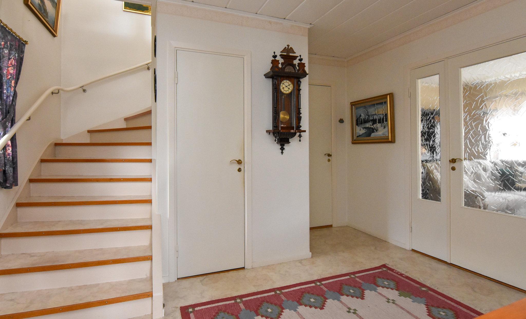 Ljus rymlig hall med trapp till övre plan samt till nedre plan. Här finns en platsbygd garderob samt plats för kappavhängning.